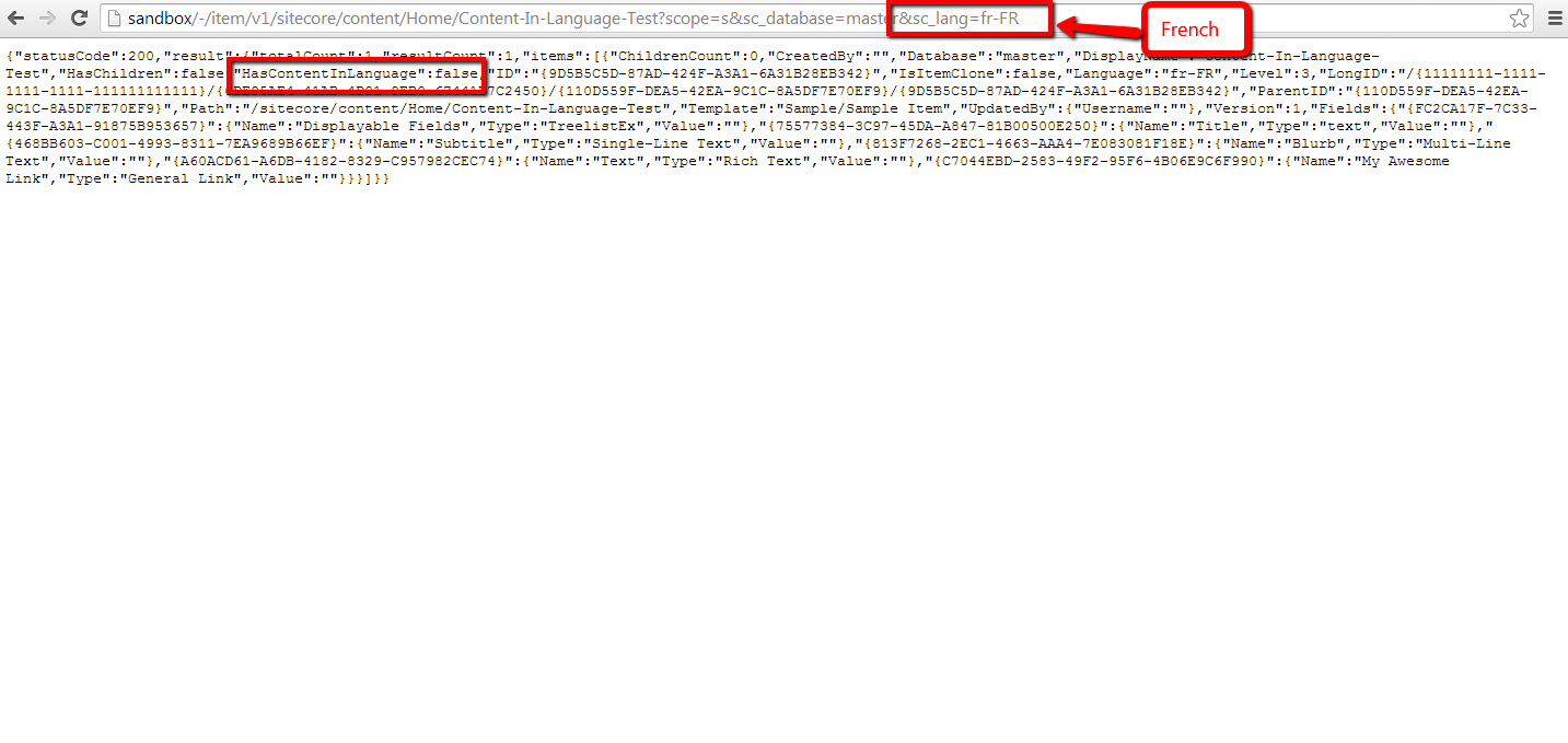 As expected, the ‘HasContentInLanguage’ is false since the Item does not have content in French.