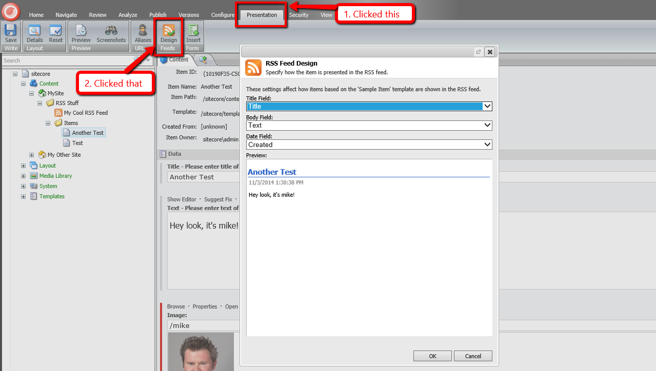 I then mapped the above subclass of Sitecore.Syndication.PublicFeed to the RSS Feed Item I created: