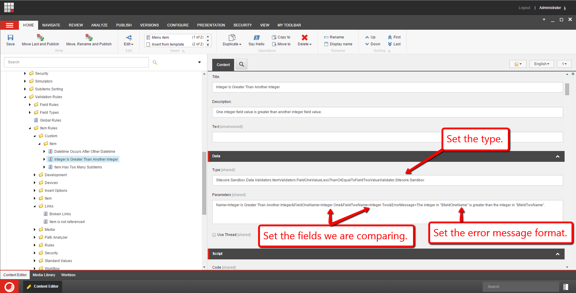 In this “proof of concept”, I am using an Item Validator to call a factory method to obtain a “fields comparer” object to ascertain whether one field contains a value greater than a value in another field, and will show this for two different field types in Sitecore.