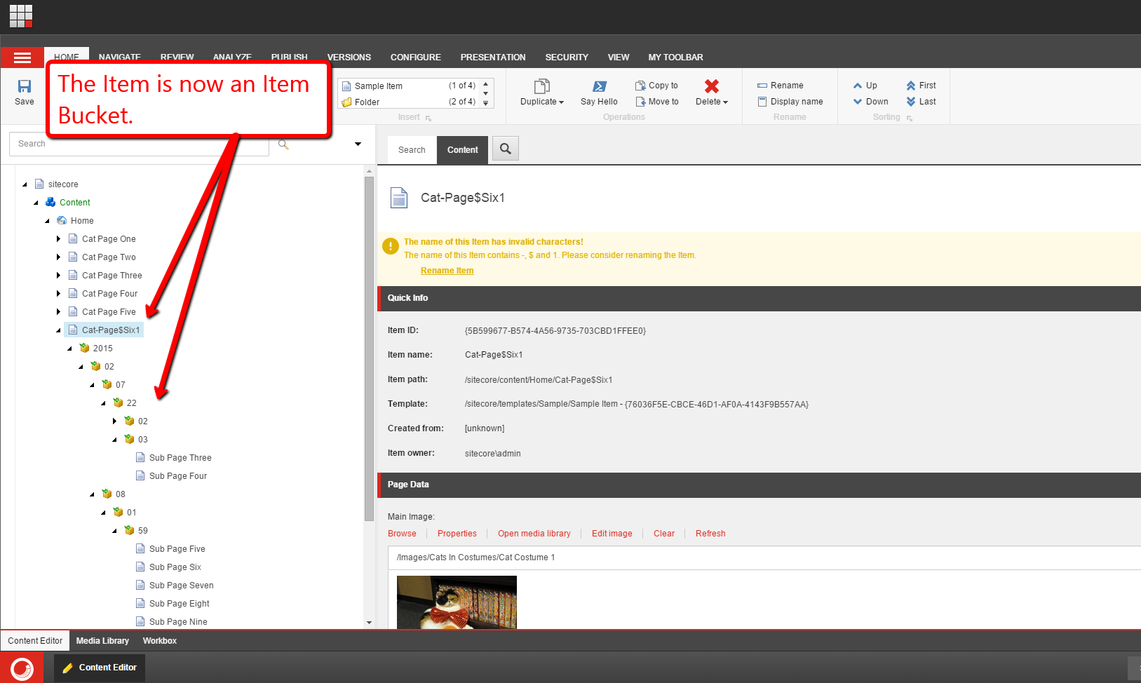 The Item’s name is now fixed, and there are no more content editor warnings: