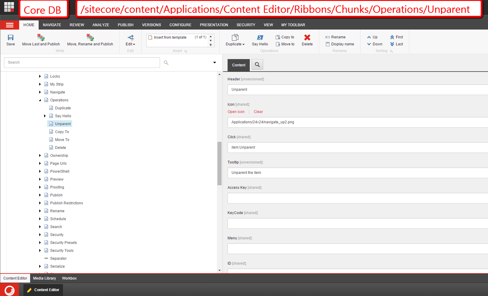 Now that the above command is registered in Sitecore, we must bind it to Sitecore ribbon. I did that in the core database: