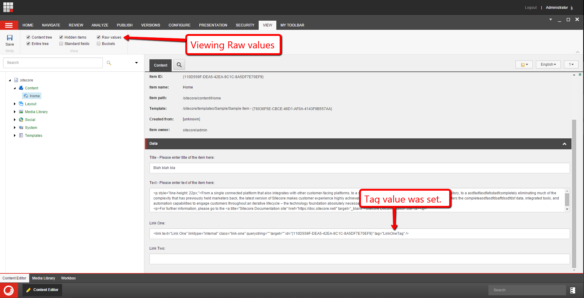 After clicking the “OK” button and saving the Item, I looked at the “Raw values” on the field and saw that the tag was added to the field’s xml: