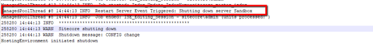 Also as expected, my Sitecore instance froze up as it was restarting — remember, I am testing this on a single development instance of Sitecore where I don’t have a separate CM and CD . I then saw this in my logs: