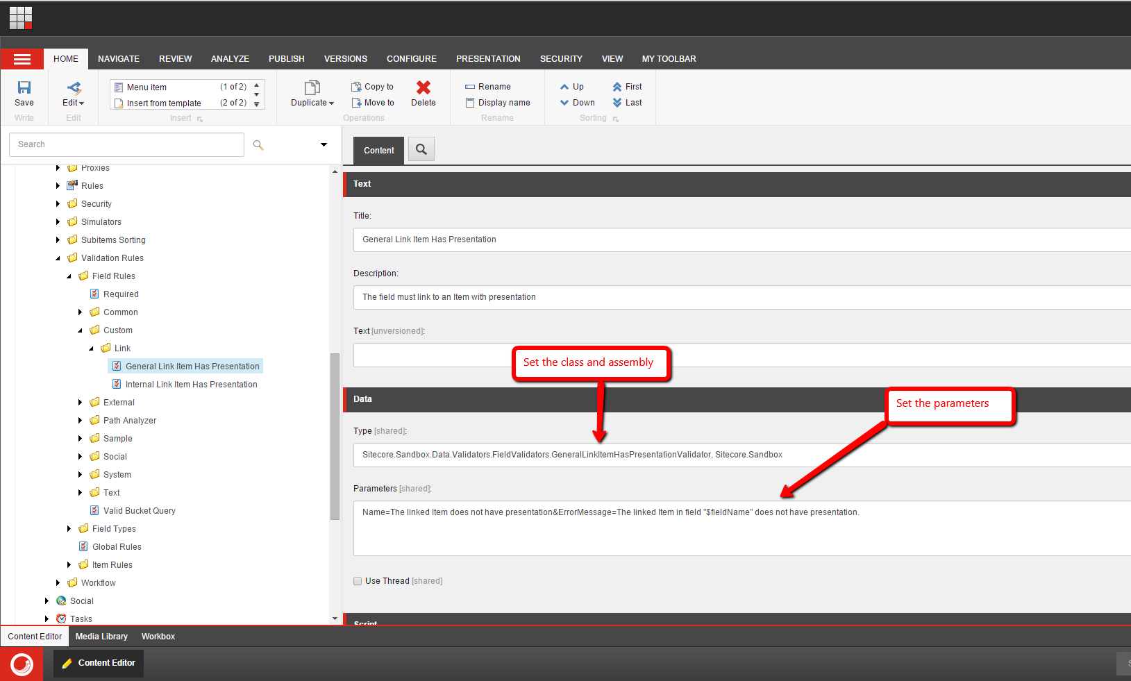 I then had to map the above field validator classes to Validation Rule Items — these have the /sitecore/templates/System/Validation/Validation Rule template — in Sitecore: