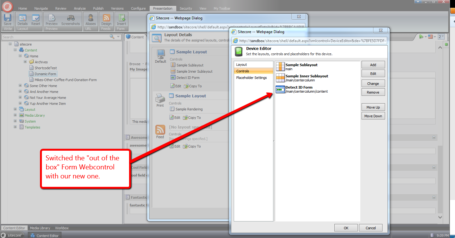 I decided to reuse an existing page item with a WFFM form — I didn’t want to step through ‘Insert Form’ wizard so that I could save time — and swapped out the “out of the box” Form Webcontrol with the new one we created above: