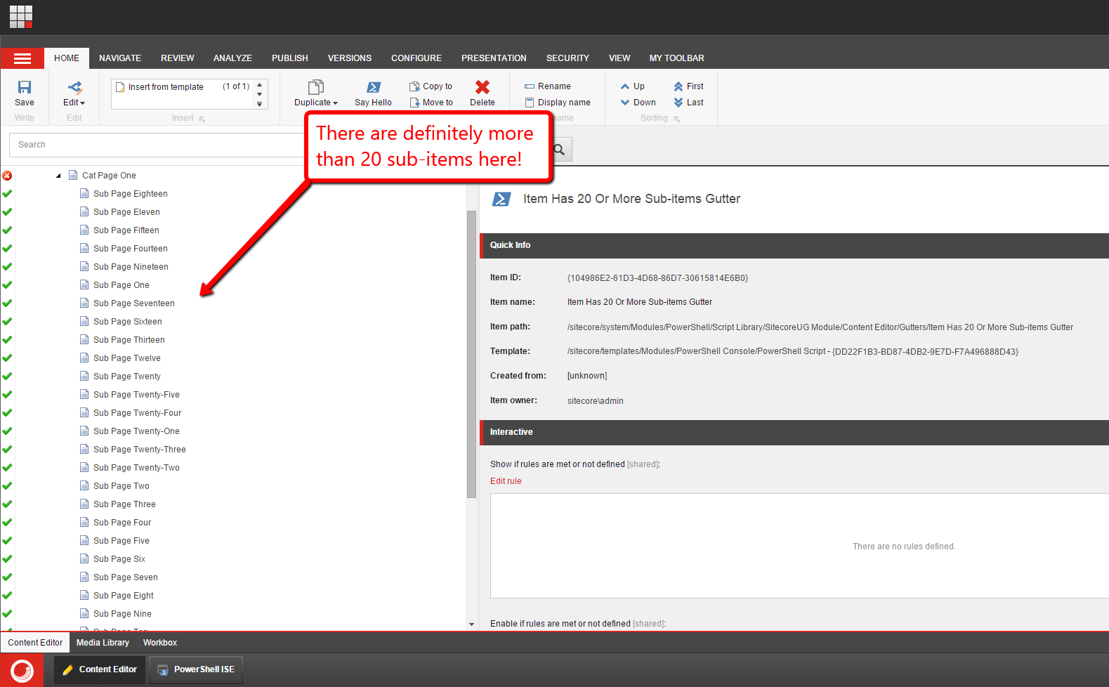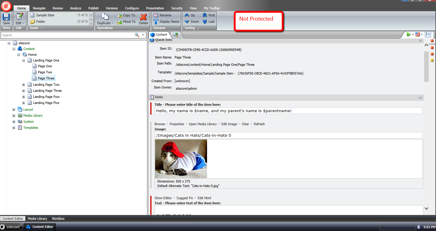 Let’s now unprotect them. I ran a script on the home Item using our new command to unprotect an item, and supplied the Recurse switch to process all descendants: