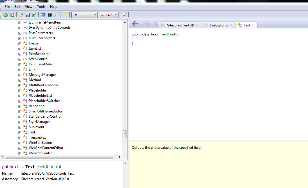 Further, the only method that might be of interest in overriding in a FieldControl base class — a class other than Text — would be the PopulateParameters method — albeit an argument could be made for overriding the DoRender method, but I will not discuss this method here. The PopulateParameters method sets parameters that are used by the RendererField pipeline for passing arguments to the Renderer object — the latter object creates the HTML for the control.